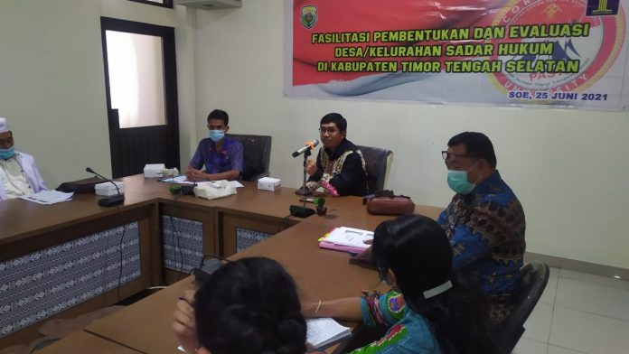 (Vibizmedia – Nasional) Kepala Divisi Pelayanan Hukum dan HAM, Arfan Faiz Muhlizi memberikan arahan dalam kegiatan fasilitasi pembentukan dan pembinaan Desa/Kelurahan Sadar Hukum di Soe, Kabupaten Timor Tengah Selatan, Jumat (25/06/2021). Dalam kegiatan yang dibuka oleh Samuel Fallo selaku Asisten Sosial dan Pemerintahan Kabupaten Timur Tengah Selatan dan dihadiri oleh para Kepala Desa, Lurah, Tokoh Agama dan Tokoh Masyarakat tersebut, Arfan menyampaikan bahwa status “sadar hukum” bukanlah sekedar formalitas belaka. Oleh karena itu perlu dilakukan pembinaan secara berkesinambungan agar empat dimensi yang menjadi syarat bagi desa/kelurahan sadar hukum, yaitu dimensi informasi, dimensi akses keadilan, dimensi implementasi, serta dimensi demokrasi dan regulasi dapat dipenuhi serta dirawat dengan baik.