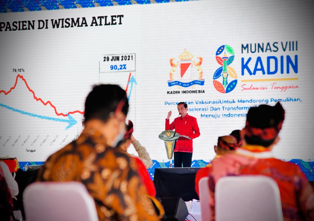 “Kunci dari urusan ekonomi yang kita hadapi ini adalah bagaimana Covid ini dikurangi, ditekan agar hilang dari Bumi Pertiwi ini,” ujar Presiden saat memberikan sambutan pada pembukaan Musyawarah Nasional (Munas) VIII Kamar Dagang dan Industri (Kadin) Tahun 2021 yang digelar di halaman Masjid Al-Alam, Kota Kendari, Provinsi Sulawesi Tenggara, Rabu, 30 Juni 2021.