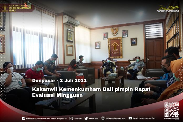 (Vibizmedia -Nasional) Denpasar – Jumat, 2 Juli 2021 bertempat di Ruang Arjuna Kantor Wilayah Kementerian Hukum dan Hak Asasi Manusia Bali Kepala Kantor Wilayah Kementerian Hukum dan Hak Asasi Manusia Bali (Jamaruli Manihuruk) memimpin Rapat Evaluasi Kinerja Pejabat Struktural. Rapat tersebut juga dihadiri oleh Kepala Divisi Pelayanan Hukum dan HAM, Kepala Divisi Pemasayarakatan, dan seluruh Pejabat Administrasi di Lingkungan Kanwil Kemenkumham Bali.