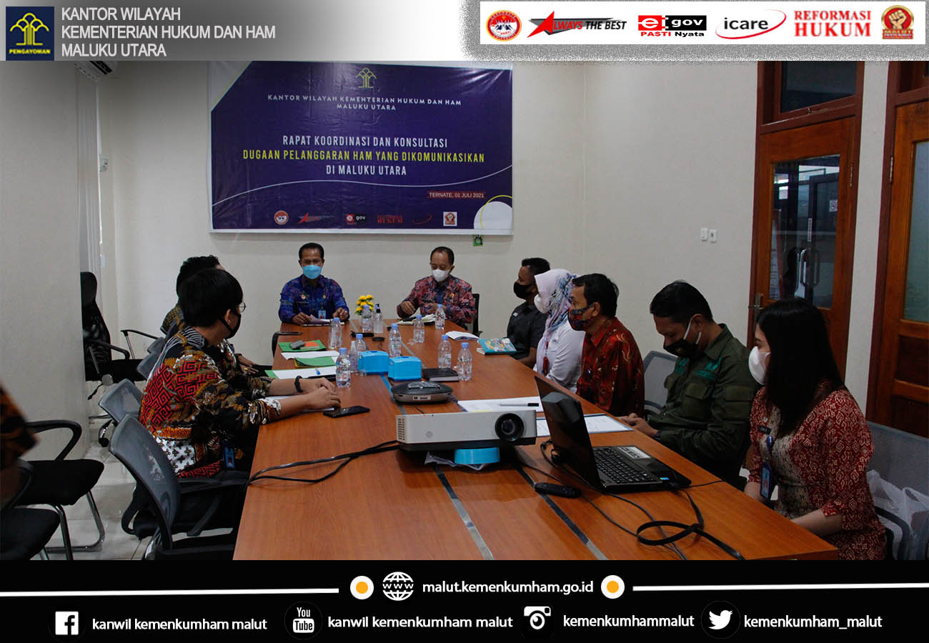 (Vibizmedia – Nasional) Ternate, malut.kemenkumham.go.id – Kantor Wilayah (Kanwil) Kementrian Hukum dan HAM (Kemenkumham) Maluku Utara (Malut) melaksanakan kegiatan rapat koordinasi dan konsultasi dugaan pelanggaran HAM yang dikomunikasikan di Maluku Utara bertempat di Ruang Rapat Kanwil Kementerian Hukum dan HAM Malut, Kamis (01/07/2021).