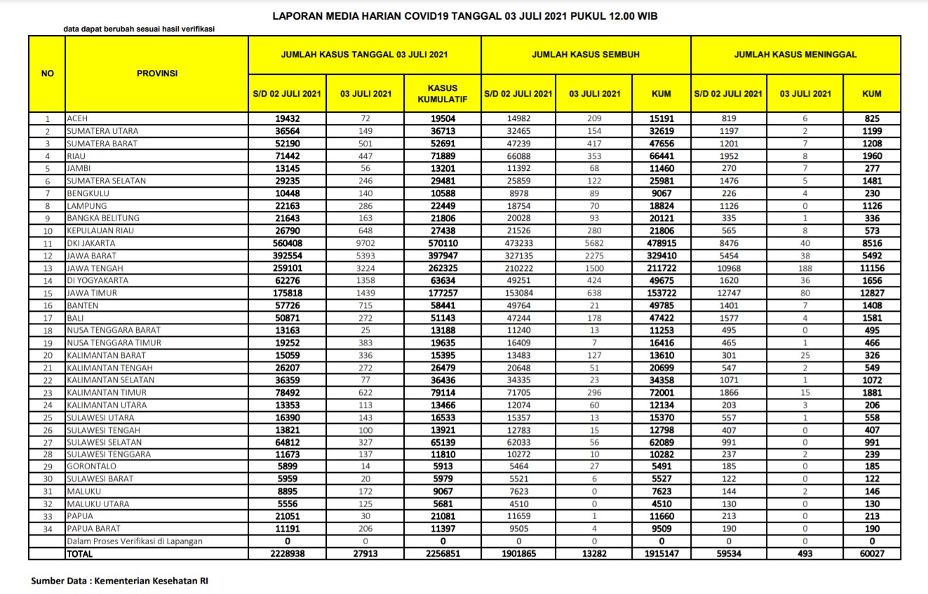 (Vibizmedia – Nasional) Berikut adalah angka akumulatif perkembangan data kasus Covid-19 dari seluruh Indonesia hingga tanggal 3 Juli 2021