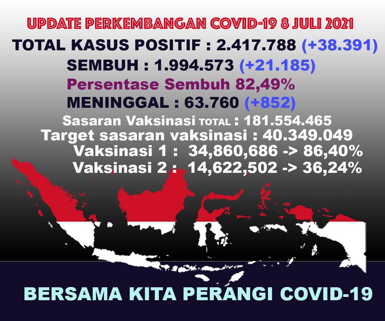 (Vibizmedia – Nasional) Berikut adalah angka akumulatif perkembangan data kasus Covid-19 dari seluruh Indonesia hingga tanggal 8 Juli 2021