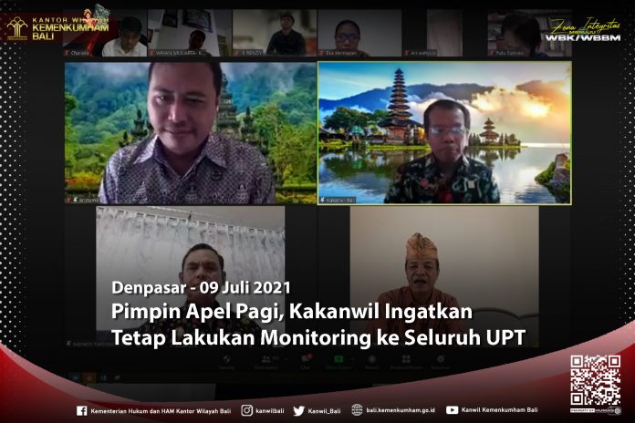 (Vibizmedia – Nasional) DENPASAR – Jumat, 09 Juli 2021, Kepala Kantor Wilayah Kementerian Hukum dan HAM Bali (Jamaruli Manihuruk) memimpin Apel Pagi secara daring melalui Zoom. Hadir pula dalam kesempatan tersebut Para Pejabat Tinggi Pratama, Para Pejabat Administrasi, serta seluruh Pegawai Kantor Wilayah Kementerian Hukum dan HAM Bali.