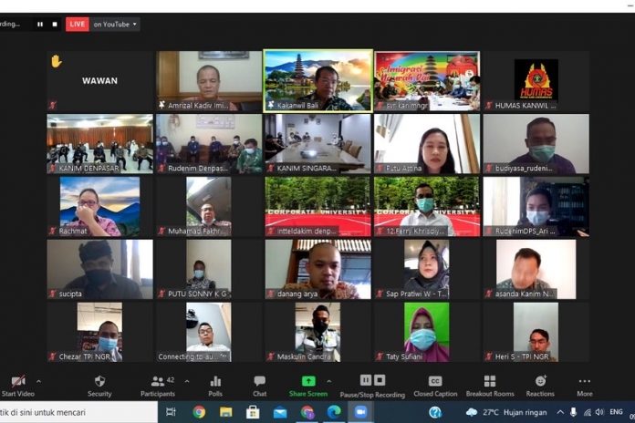 (Vibizmedia – Nasional) Jumat, 9 Juli 2021 melalui Rapat Daring dengan Jajaran Imigrasi Se-Bali , Kepala Kantor Wilayah Kementerian Hukum dan Hak Asasi Manusia Bali (Jamaruli Manihuruk) menginstruksikan untuk mengerahkan seluruh kemampuan serta sumber daya yang ada dalam membantu pemerintah menerapkan Pemberlakukan Pembatasan Kegiatan Masyarakat (PPK) Darurat dari tanggal 3 Juli hingga 20 Juli 2021 khususnya dalam pengawasan Terhadap Warga Negara Asing. Hadir dalam rapat tersebut, Kepala Divisi Keimigrasian, Para Kepala Unit Pelaksana Teknis, Pejabat Struktural dan Pejabat Keimigrasian di Lingkungan Kantor Wilayah Kementerian Hukum dan Hak Asasi Manusia Bali.