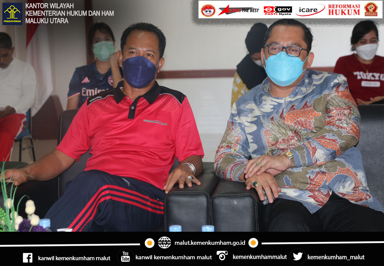 Kepala Kanwil Kemenkumham Malut M. Adnan didampingi Plt Kepala Divisi (Kadiv) Pelayanan Hukum dan HAM yang juga Kadiv Administrasi Raymond J.H. Takasenseran, Kadiv Pemasyarakatan Teguh Wibowo, Kadiv Keimigrasian Filianto Akbar, Kabid HAM Ismail, Kasubbid Pemajuan HAM Teguh Firmanto, beserta jajaran Kanwil Kemenkumham Malut mengikuti rapat virtual tersebut dengan menerapkan protokol kesehatan, langsung dari aula Kanwil.