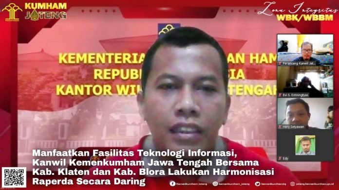 Memanfaatkan teknologi informasi, Kanwil Kemenkumham Jawa Tengah menggelar Rapat Pengharmonisasian, Pembulatan, dan Pemantapan Konsepsi Rancangan Peraturan Daerah Kabupaten Klaten dan Kabupaten Blora secara virtual, Jumat (09/07).