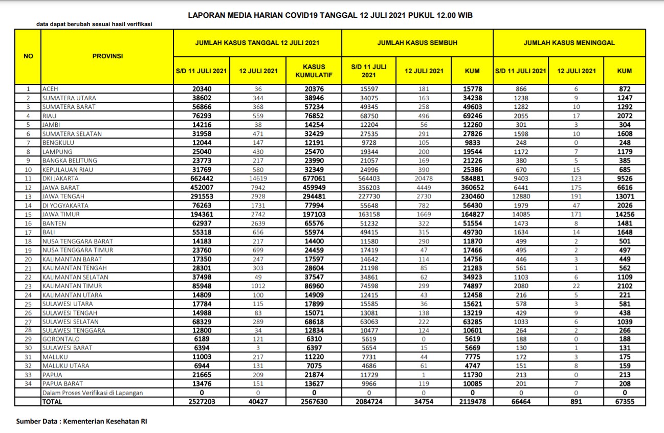 Berikut adalah data COVID-19 di seluruh provinsi pada tanggal 12 Juli 2021: