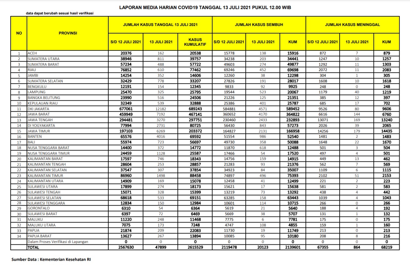 Berikut adalah data COVID-19 di seluruh provinsi pada tanggal 13 Juli 2021: