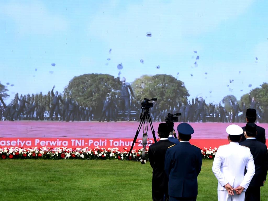 “Bahwa saya akan memenuhi kewajiban perwira dengan sebaik-baiknya terhadap bangsa Indonesia dan Negara Kesatuan Republik Indonesia yang berdasarkan Pancasila dan Undang-Undang Dasar Negara Republik Indonesia tahun 1945,” ujar Presiden mendiktekan sumpah perwira TNI dan Polri.
