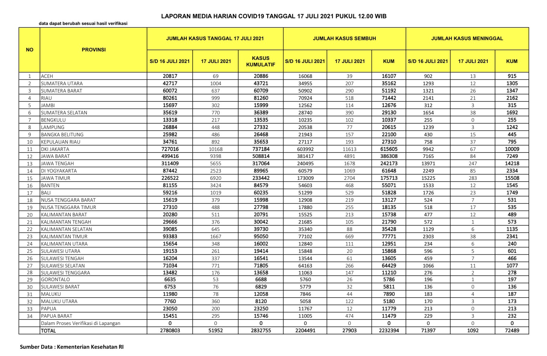Berikut adalah data COVID-19 di seluruh provinsi pada tanggal 17 Juli 2021: