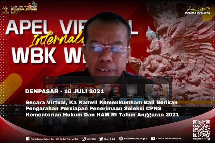 (Vibizmedia – Nasional) DENPASAR – Jumat, 16 Juli 2021 Kepala Kantor Wilayah Kementerian Hukum dan Hak Asasi Manusia Bali, Jamaruli Manihuruk memberikan pengarahan kepada terkait Persiapan Penerimaan CPNS Kementerian Hukum dan HAM RI kepada Tim Verifikator Berkas Administrasi CPNS Kanwil Kemenkumham Bali. Kepala Divisi Pelayanan Hukum dan HAM Constantinus Kristomo membuka Kegiatan Teleconference yang menyampaikan bahwa Pelaksanaan Verifikasi Dokumen Unggah Penerimaan CPNS di Lingkungan Kementerian Hukum dan HAM RI Tahun Anggaran 2021 dilakukan pada tanggal 15 sampai dengan 28 Juli 2021. Berikutnya, Kepala Bagian Umum, Dayu Susanti menjelaskan lebih lanjut mengenai pelaksanaan Verifikasi Dokumen Unggah Penerimaan CPNS. Tahapan verifikasi berkas untuk pelamar tingkat SLTA dilakukan oleh Panitia Seleksi CPNS di Lingkungan Kantor Wilayah Kementerian Hukum dan HAM Bali, sedangkan untuk pelamar tingkat non SLTA dilakukan oleh Panitia Pusat, yaitu Kementerian Hukum dan HAM Republik Indonesia. Beliau menyampaikan bahwa per tanggal 15 Juli 2021 kemarin, terdapat sebanyak 2809 pelamar tingkat SLTA yang sudah mengirim lamaran untuk formasi Penjaga Tahanan dan Pemeriksa Keimigrasian.