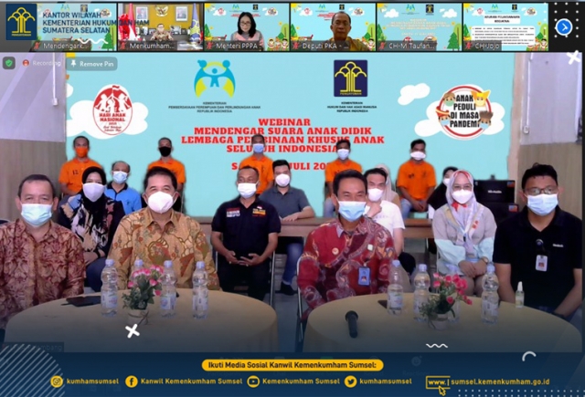 Kepala Kantor Wilayah Kementerian Hukum dan HAM Sumatera Selatan Indro Purwoko mendukung penuh kegiatan ini, melalui Kepala Divisi Pemasyarakatan (Dadi Mulyadi), Kepala Lembaga Pembinaan Khusus Anak (LPKA) Klas I Palembang (Tri Wahyudi), dan Kasubag Humas, RB dan TI (Hamsir) untuk berpartisipasi dalam giat yang digelar secara virtual tersebut. “Kementeran Hukum dan HAM selaku instansi yang mewadahi anak-anak berhadapan dengan hukum sangat berperan penting dalam memberikan pembinaan dan pengajaran kepada anak-anak yang ada di LPKA,” jelas Dadi.