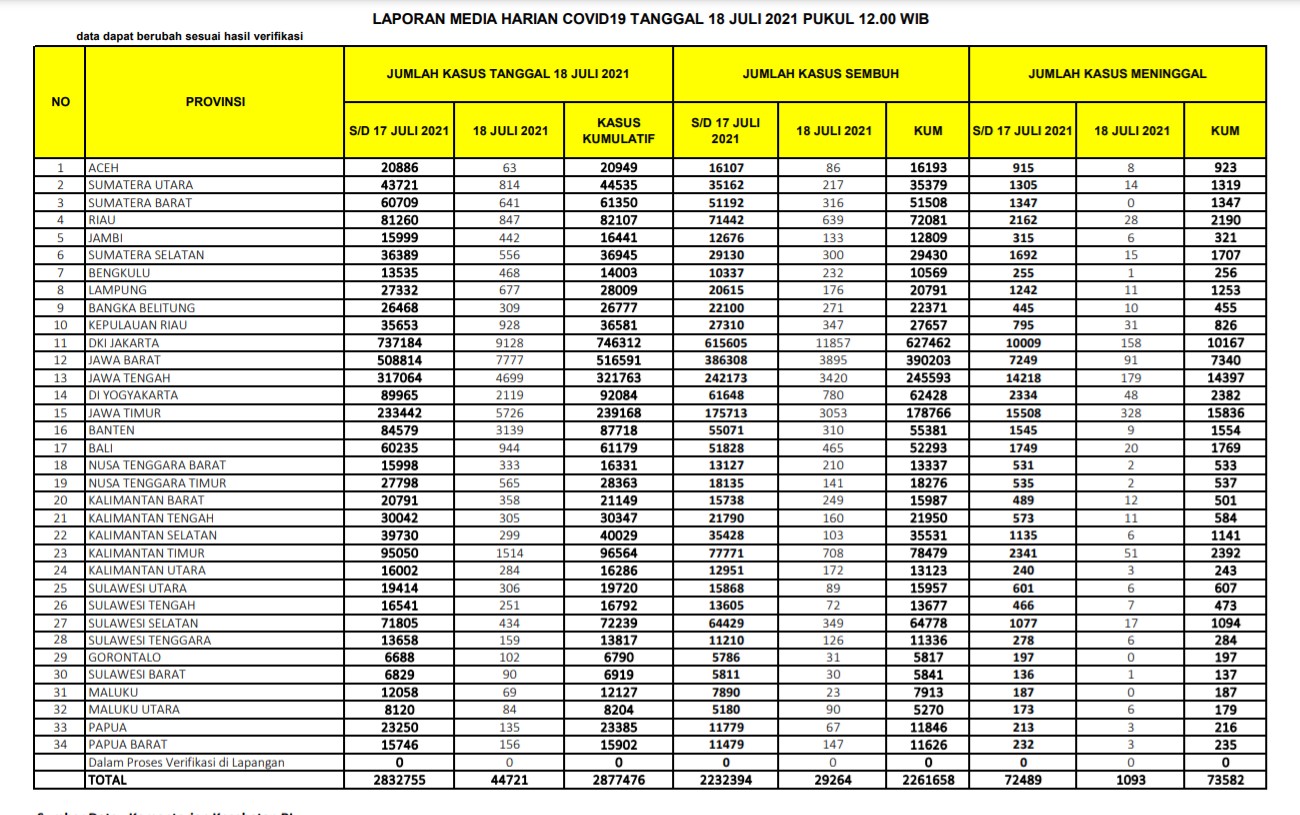 Berikut adalah data COVID-19 di seluruh provinsi pada tanggal 18 Juli 2021: