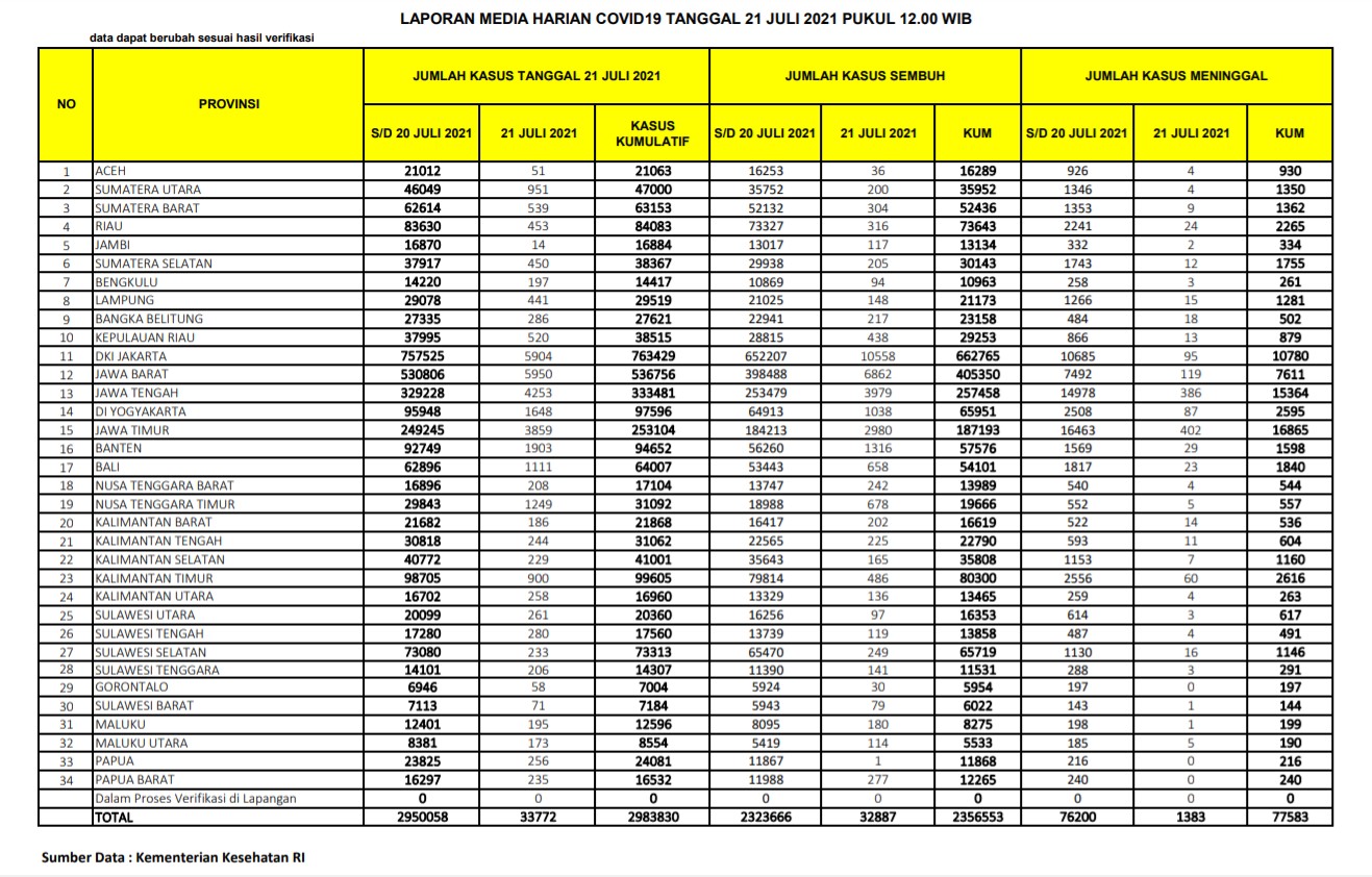 Berikut adalah data COVID-19 di seluruh provinsi pada tanggal 21 Juli 2021: