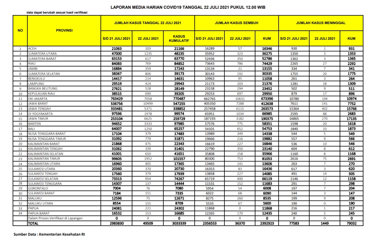 Berikut adalah data COVID-19 di seluruh provinsi pada tanggal 22 Juli 2021: