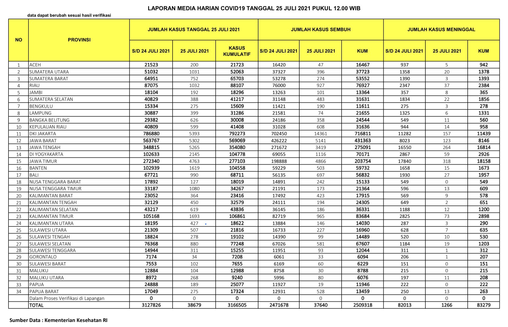 (Vibizmedia – Nasional) Berikut adalah angka akumulatif perkembangan data kasus Covid-19 dari seluruh Indonesia hingga tanggal 25 Juli 2021