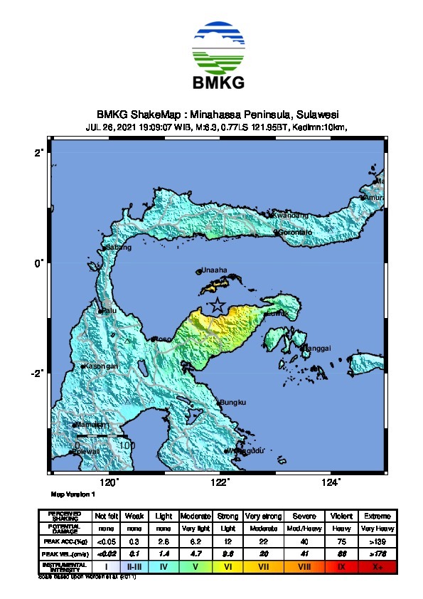 Sedangkan kekuatan gempa yang diukur dengan skala MMI atau Modified Mercalli Intensity menunjukkan V – VI MMI di Ampana, V MMI di Poso dan Morowali, III – IV MMI di Bolaang Mongdow Selatan, Bolaang Mongondow Timur, Kotamobago, Buol dan Bone, II – III MMI di Bobong, Konawe Utra, Tomohon, Manado, Kolaka Utara dan Masamba, serta II MMI di Mamuju Tengah dan Polewali.