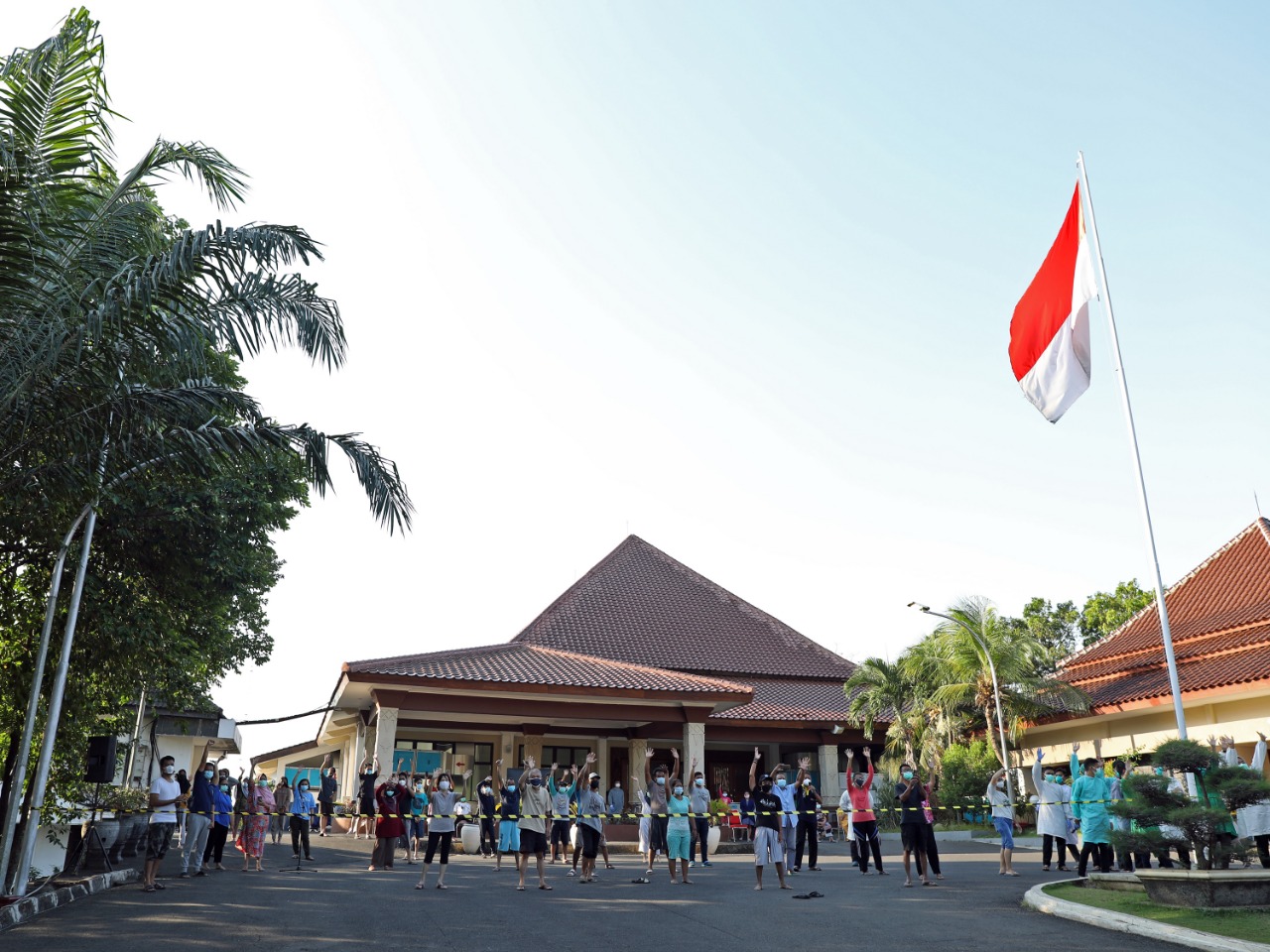 Sejumlah pasien peserta isolasi berolahraga rutin sore hari di tempat isolasi mandiri terpusat Rumah Dinas Wali Kota Semarang, Semarang, Jawa Tengah, pada Minggu, 25 Juli 2021. FOTO: BNPB