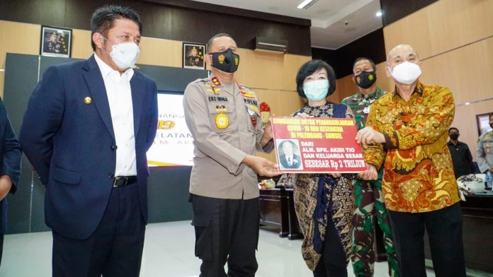(Vibizmedia-Sumsel) Bantuan hibah uang sebesar Rp 2 triliun diberikan oleh keluarga mendiang pengusaha Akidi Tio untuk penanganan COVID-19 di Sumatera Selatan. Secara simbolis hibah sebesar Rp 2 triliun itu diterima langsung oleh Kapolda Sumsel, Irjen Pol Eko Indra Heri di Ruang Rekonfu Polda Sumsel, Senin (26/7).
