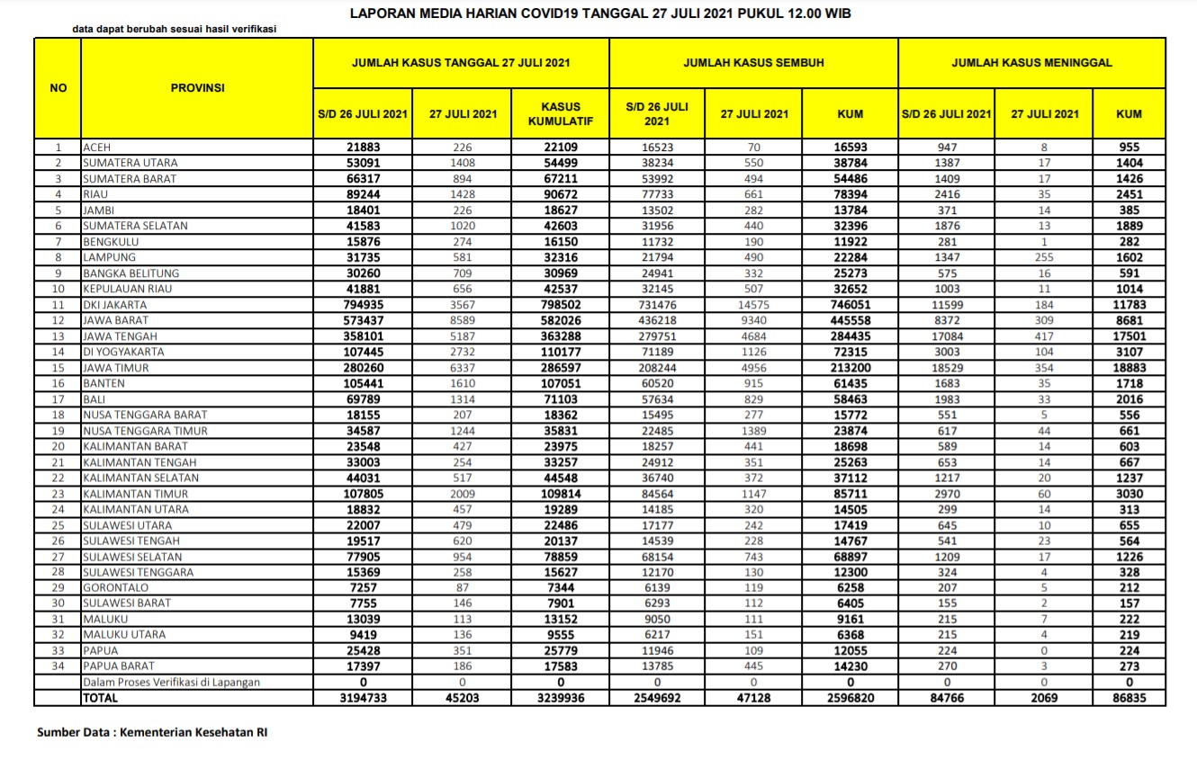 (Vibizmedia – Nasional) Berikut adalah angka akumulatif perkembangan data kasus Covid-19 dari seluruh Indonesia hingga tanggal 27 Juli 2021