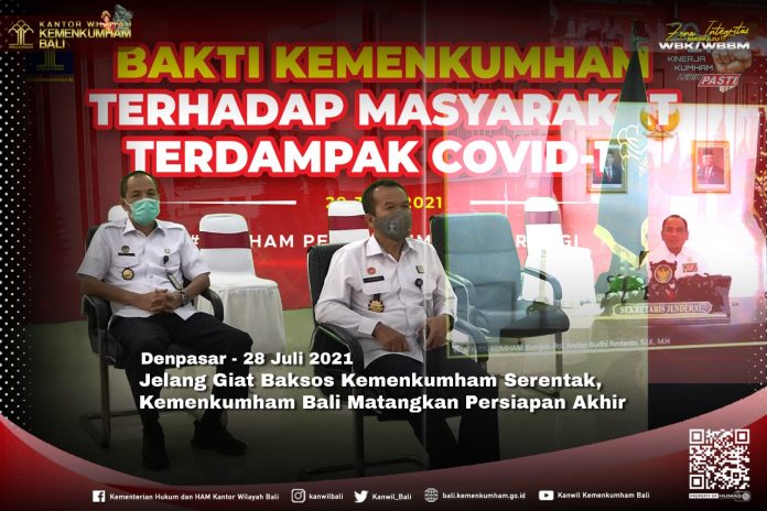 (Vibizmedia – Nasional) Rabu, 28 Juli 2021, Kepala Kantor Wilayah Kementerian Hukum dan HAM Bali (Jamaruli Manihuruk) didampingi Kepala Divisi Keimigrasian (Amrizal) mengikuti Gladi Bersih Kegiatan ‘Kumham Peduli, Kumham Berbagi’ bertempat di Ruang Dharmawangsa Kanwil Kemenkumham Bali.