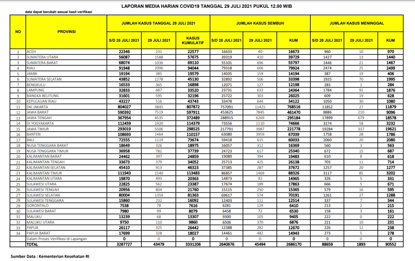 Berikut adalah data COVID-19 di seluruh provinsi pada tanggal 29 Juli 2021: