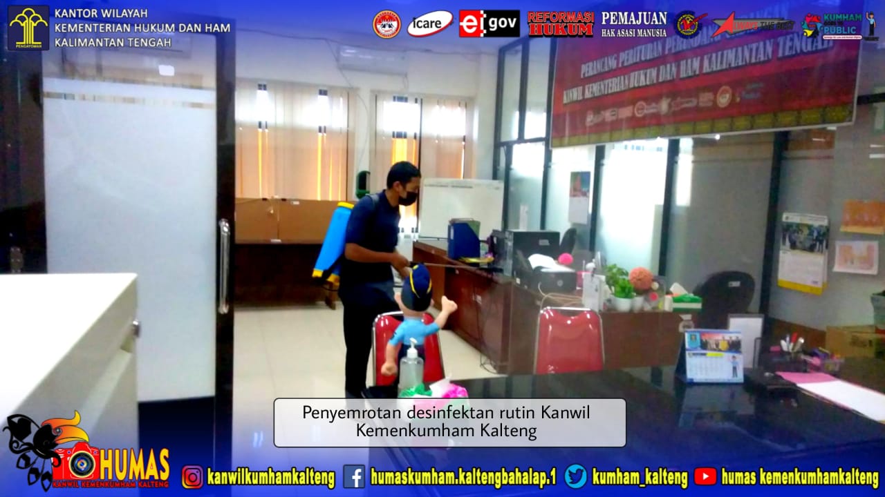 Kegiatan penyemprotan disinfektan di Kanwil Kemenkumham Kalteng ini dibantu oleh anggota Tim Kebersihan Kanwil Kemenkumham Kalteng. Kegiatan ini telah dilakukan secara rutin agar efektif dalam mencegah masuknya Covid-19 ke dalam Kanwil Kemenkumham Kalteng. Selain itu juga seluruh pegawai harus tetap taat pada protokol kesehatan yang ada seperti tetap menggunakan masker dan selalu mencuci tangan dan memakai hand sanitizer. (Reddok, Humas Kalteng, Juli 2021).