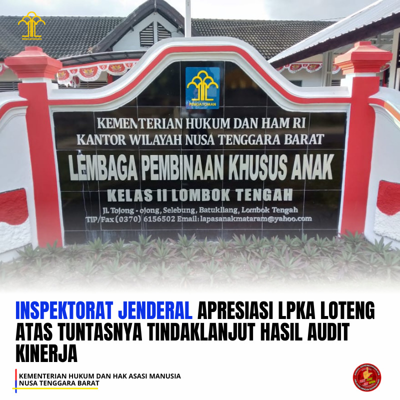 (Vibizmedia – Nasional) Mataram, 30 Juli 2021 – Lembaga Pemasyarakatan Kelas Pembinaan Khusus Anak (LPKA) Kelas II Lombok Tengah mendapatkan apresiasi dari Inspektorat Jenderal Kemenkumham RI yang telah menindaklanjuti rekomendasi atas Pengelolaan Keuangan Negara TA. 2020 di Lingkungan Kantor Wilayah Kementerian Hukum dan HAM Nusa Tenggara Barat.