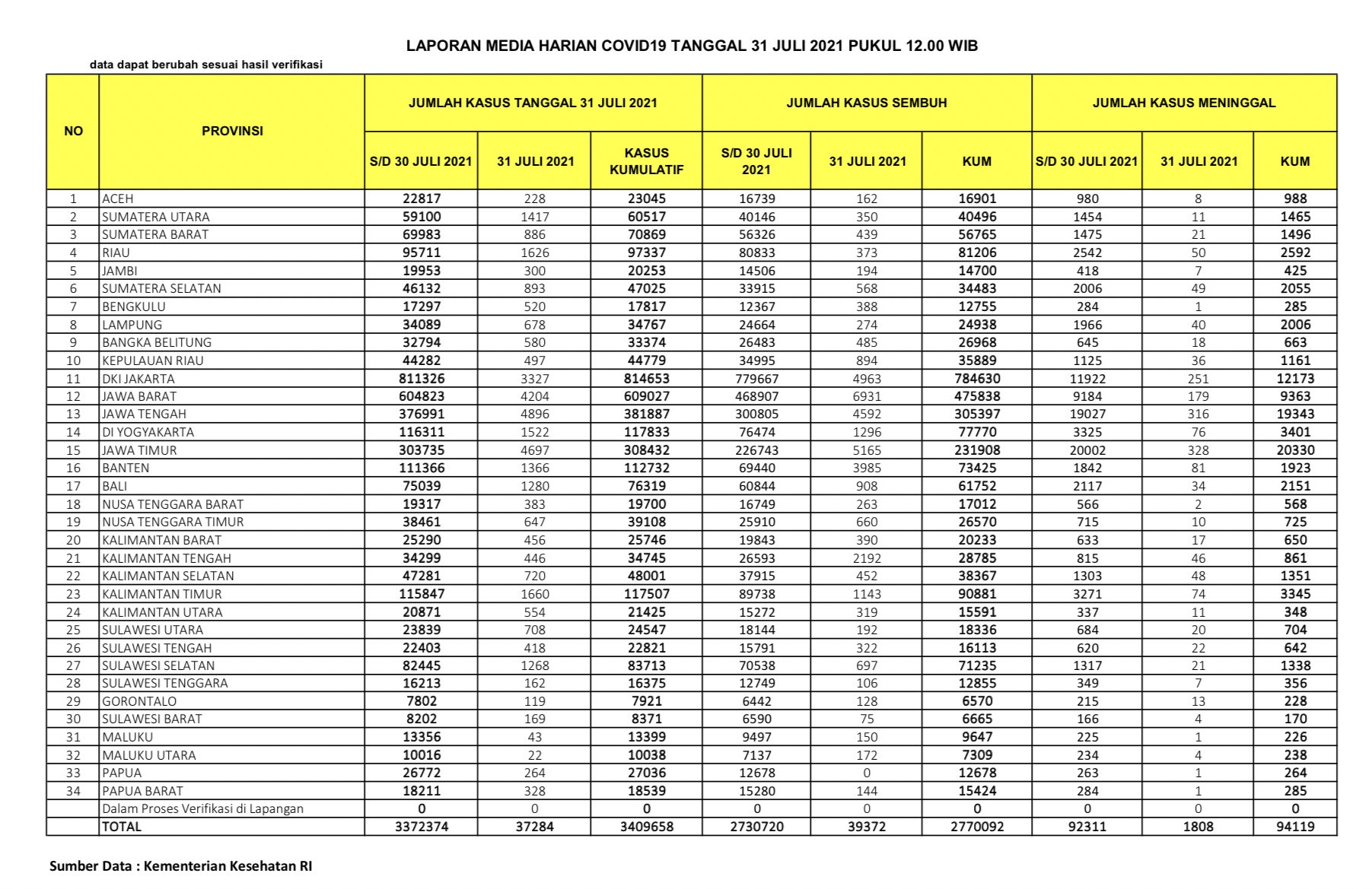 Berikut adalah data COVID-19 di seluruh provinsi pada tanggal 31 Juli 2021: