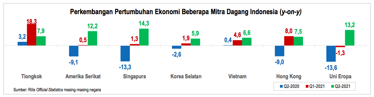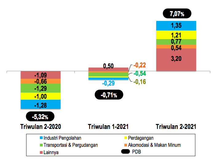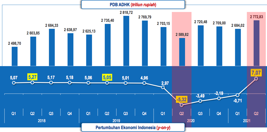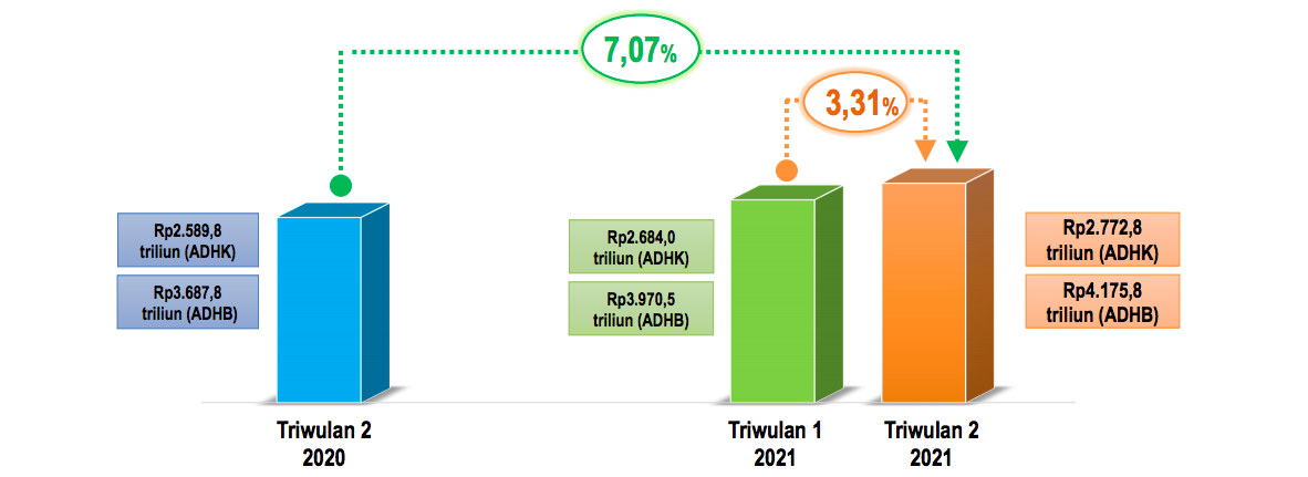 Ekonomi Indonesia triwulan II-2021 terhadap triwulan II-2020 mengalami pertumbuhan sebesar 7,07 persen (y-on-y). Dari sisi produksi, Lapangan Usaha Transportasi dan Pergudangan mengalami pertumbuhan tertinggi sebesar 25,10 persen. Dari sisi pengeluaran, Komponen Ekspor Barang dan Jasa mengalami pertumbuhan tertinggi sebesar 31,78 persen. Secara kumulatif, pertumbuhan ekonomi Indonesia Semester I-2021 dibandingkan dengan Semester 1-2020 tumbuh 3,10 persen. Ekonomi Indonesia triwulan II-2021 terhadap triwulan sebelumnya mengalami pertumbuhan sebesar 3,31 persen (q-to-q). Dari sisi produksi, Lapangan Usaha Pertanian, Kehutanan, dan Perikanan mengalami pertumbuhan tertinggi sebesar 12,93 persen. Sementara dari sisi pengeluaran, Komponen Pengeluaran Konsumsi Pemerintah (PK-P) mengalami pertumbuhan tertinggi sebesar 29,07 persen.
