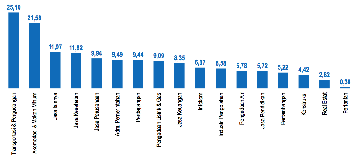 Transportasi dan Pergudangan tumbuh 25,10 persen dipengaruhi oleh: Peningkatan pergerakan penumpang semua moda transportasi umum. Peningkatan bongkar muat ekspor dan impor Indonesia.