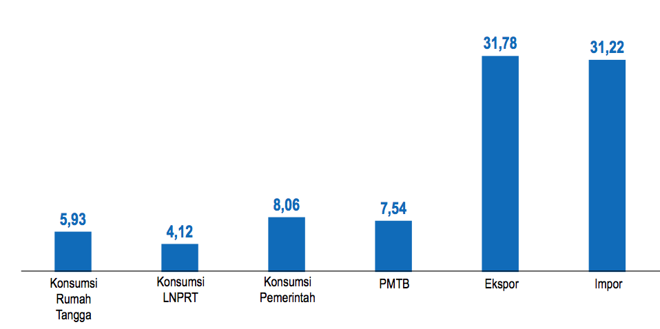 Sebesar 84,93% PDB Triwulan 2-2021 berasal dari Konsumsi Rumah Tangga dan Investasi. Konsumsi Rumah Tangga tumbuh sebesar 5,93%. Pembentukan Modal Tetap Bruto (PMTB) tumbuh 7,54%. Konsumsi Pemerintah tumbuh sebesar 8,06 persen. Ekspor Barang Dan Jasa tumbuh 31,78% dikarenakan Perekonomian sebagian besar negara mitra dagang utama Indonesia mengalami peningkatan. Ekspor nonmigas tumbuh terutama pada komoditas bahan bakar mineral; besi dan baja; serta mesin/peralatan listrik. Ekspor migas tumbuh seiring peningkatan nilai dan volume ekspor migas serta peningkatan harga komoditas migas. Impor barang dan jasa tumbuh 31,22% disebabkan karena Impor nonmigas tumbuh terutama pada komoditas mesin mesin/ pesawat mekanik; mesin/peralatan listrik; besi dan baja; serta plastik dan barang dari plastik. Impor migas tumbuh seiring dengan peningkatan nilai dan volume impor migas. Impor jasa tumbuh seiring dengan meningkatnya jasa angkutan untuk impor barang. Sumber Pertumbuhan Ekonomi Indonesia Triwulan 2-2021 (y-on-y), Konsumsi rumah tangga adalah sumber pertumbuhan tertinggi, yakni sebesar 3,17%. Struktur perekonomian Indonesia secara spasial pada Triwulan 2–2021 masih didominasi oleh kelompok provinsi di Pulau Jawa yang memberikan kontribusi terhadap PDB sebesar 57,92 persen. Pertumbuhan ekonomi Indonesia pada triwulan-II 2021 menggambarkan Indonesia segera lepas dari resesi, karena sudah lepas dari kontraksi dan masuk zona positif.