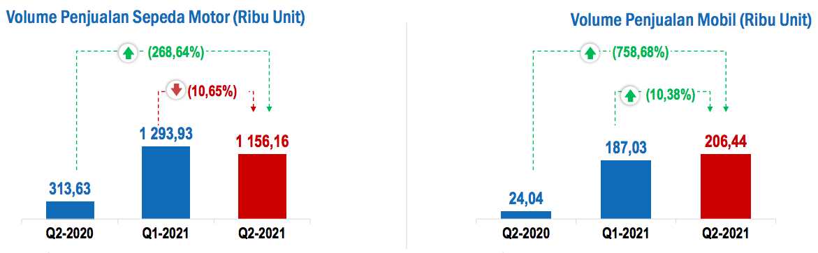 Konsumsi masyarakat dan investasi meningkat, yang diukur melalui beberapa indikator. Data volume penjualan sepeda motor meningkat sebesar 10,65 persen dari Q1 2021 ke Q2 2021, sedangkan dibandingkan dengan Q2 2020 meingkat sebesar 268,64 persen. Volume penjualan mobil juga terjadi peningkatan, dari 187,03 ribu unit di tahun 2021 menjadi 206,44 ribu unit di Q2 2021, meningkat sebesar 10,38 persen. Sedangkan angka ini jauh melonjak dibandingkan volume penjualan mobil Q2 2020 sebesar 24,04 ribu unit. Volume penjualan mobil meningkat hampir delapan kali lipat yaitu sebesar 758,68 persen.