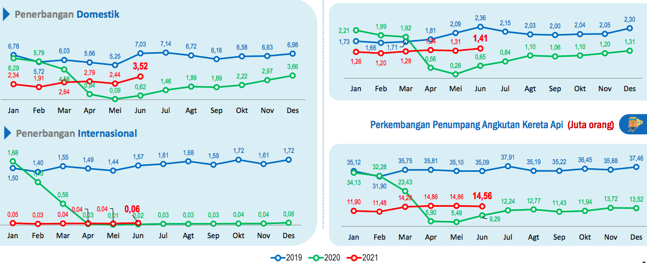 Aktivitas masyarakat pada Triwulan 2-2021 di berbagai lokasi mengalami peningkatan baik secara q-to-q maupun y-on-y. Terlihat dari indikator perkembangan penumpang angkutan udara, perkembangan penumpang angkutan laut, penerbangan internasional, perkembangan Penumpang angkutan Kereta Api. Semua indikator transportasi menunjukan peningkatan dibandingkan tahun 2020, bergerak naik mendekati angka tahun 2019.
