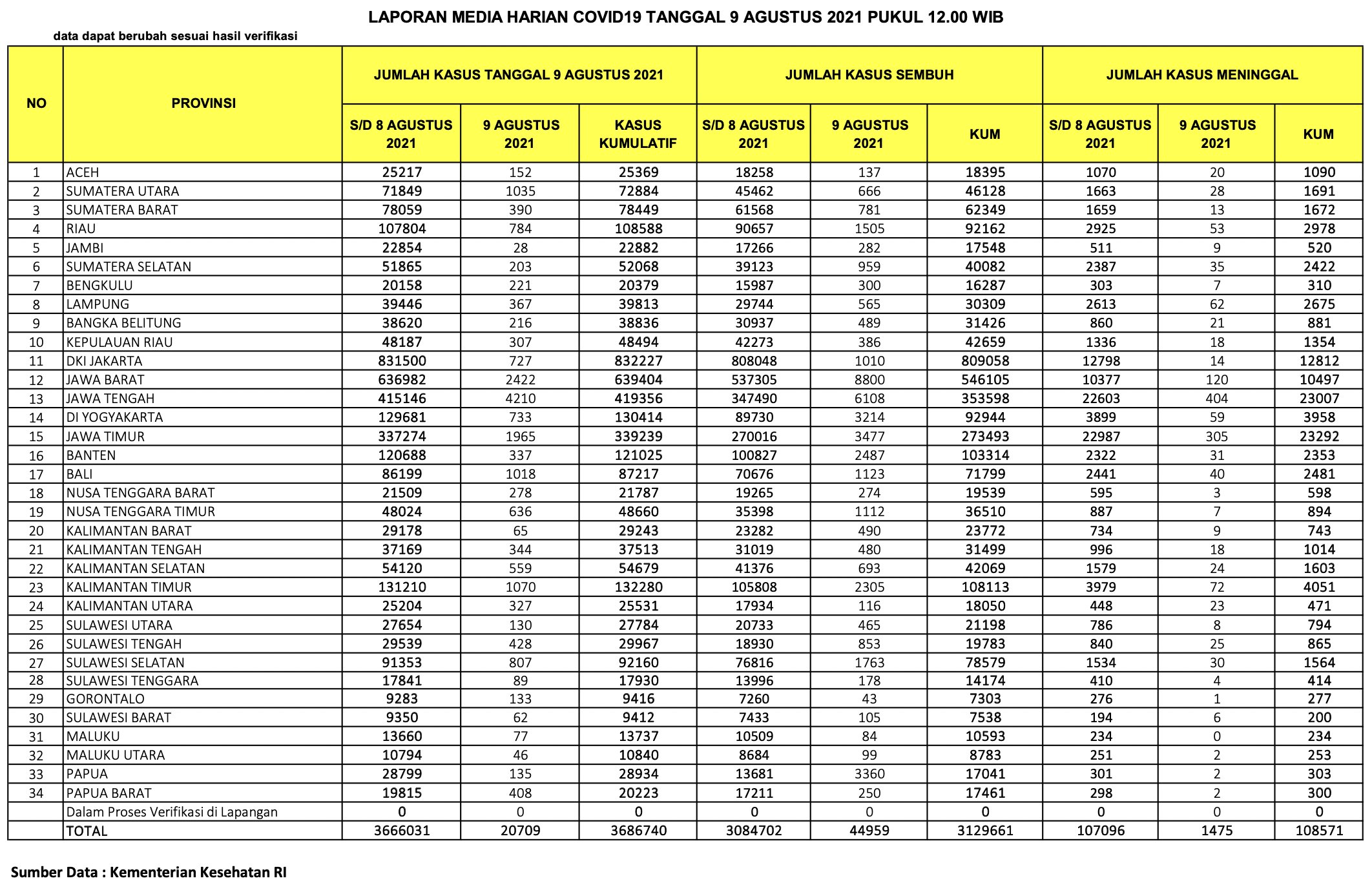 (Vibizmedia – Nasional) Berikut adalah angka akumulatif perkembangan data kasus Covid-19 dari seluruh Indonesia hingga tanggal 9 Agustus 2021