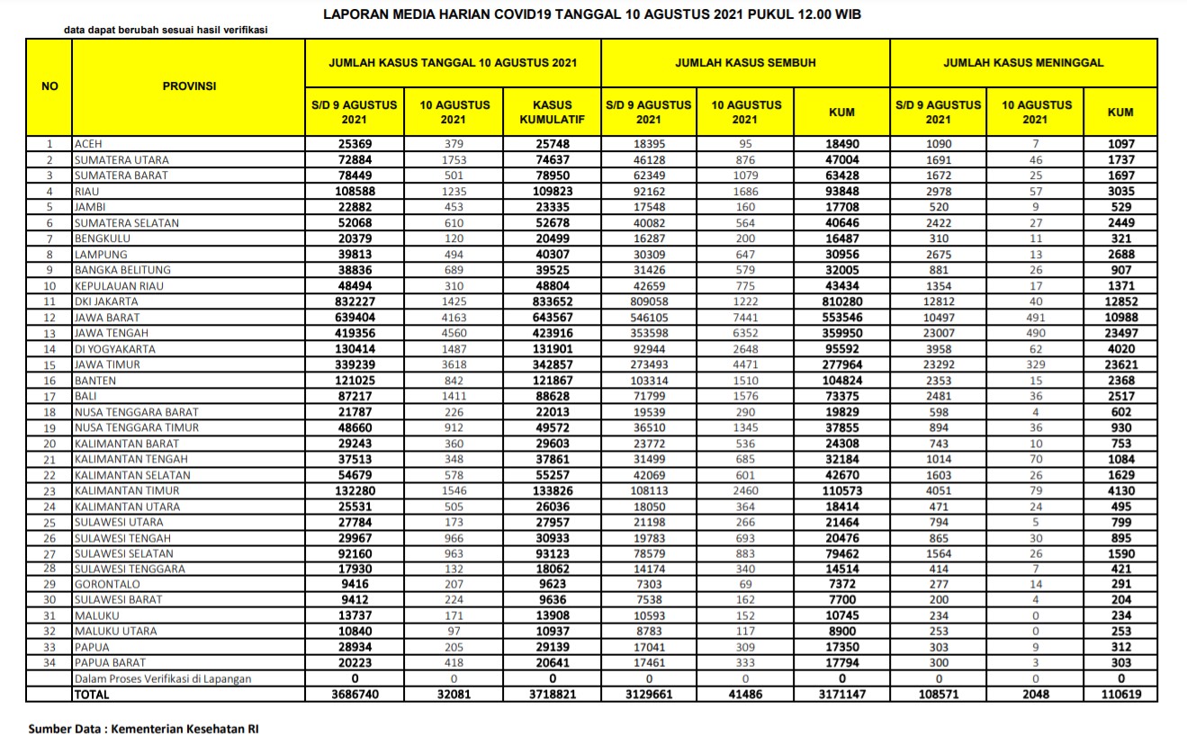 Berikut adalah data COVID-19 di seluruh provinsi pada tanggal 10 Agustus 2021: