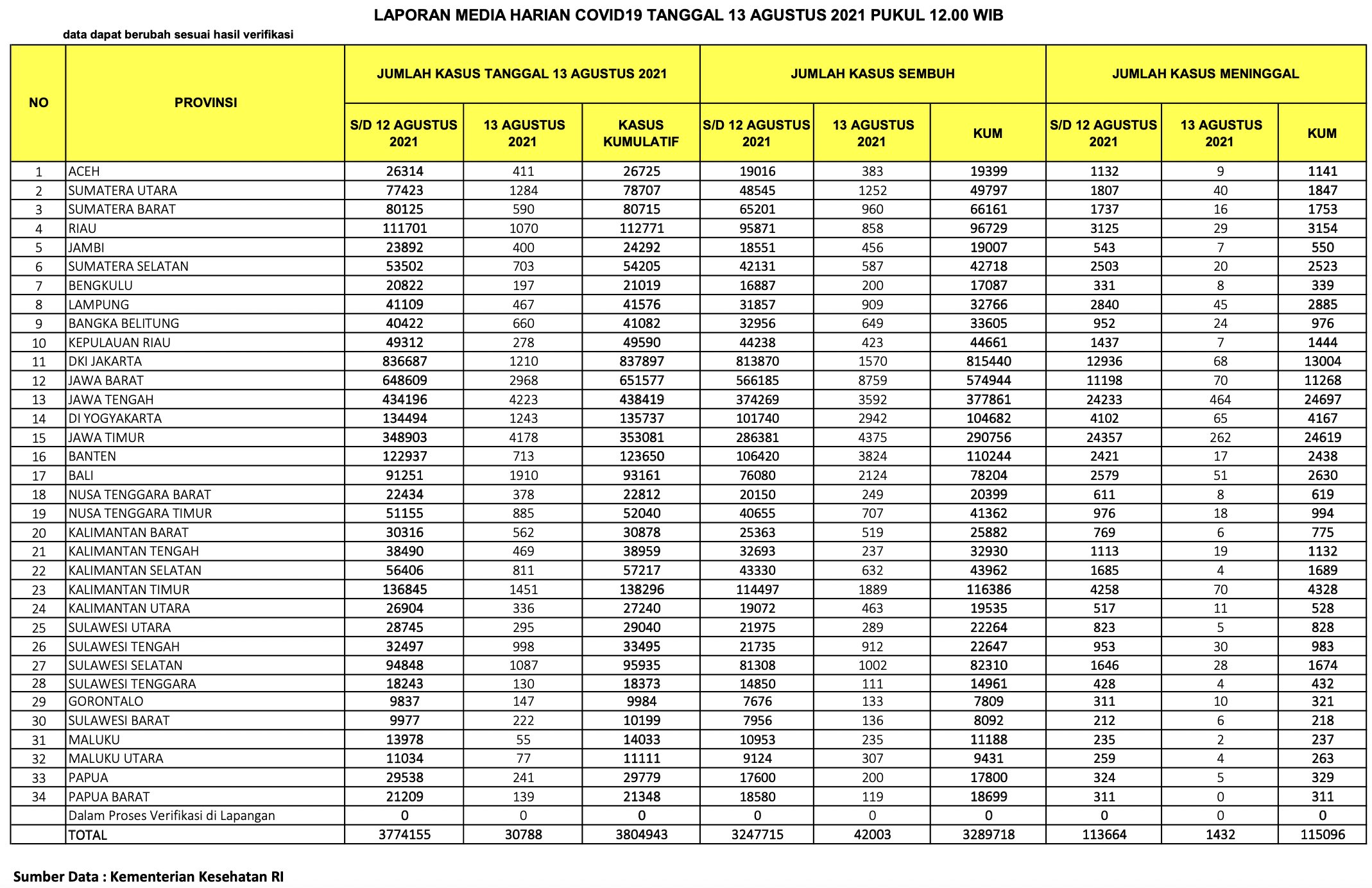 Berikut adalah data COVID-19 di seluruh provinsi pada tanggal 13 Agustus 2021: