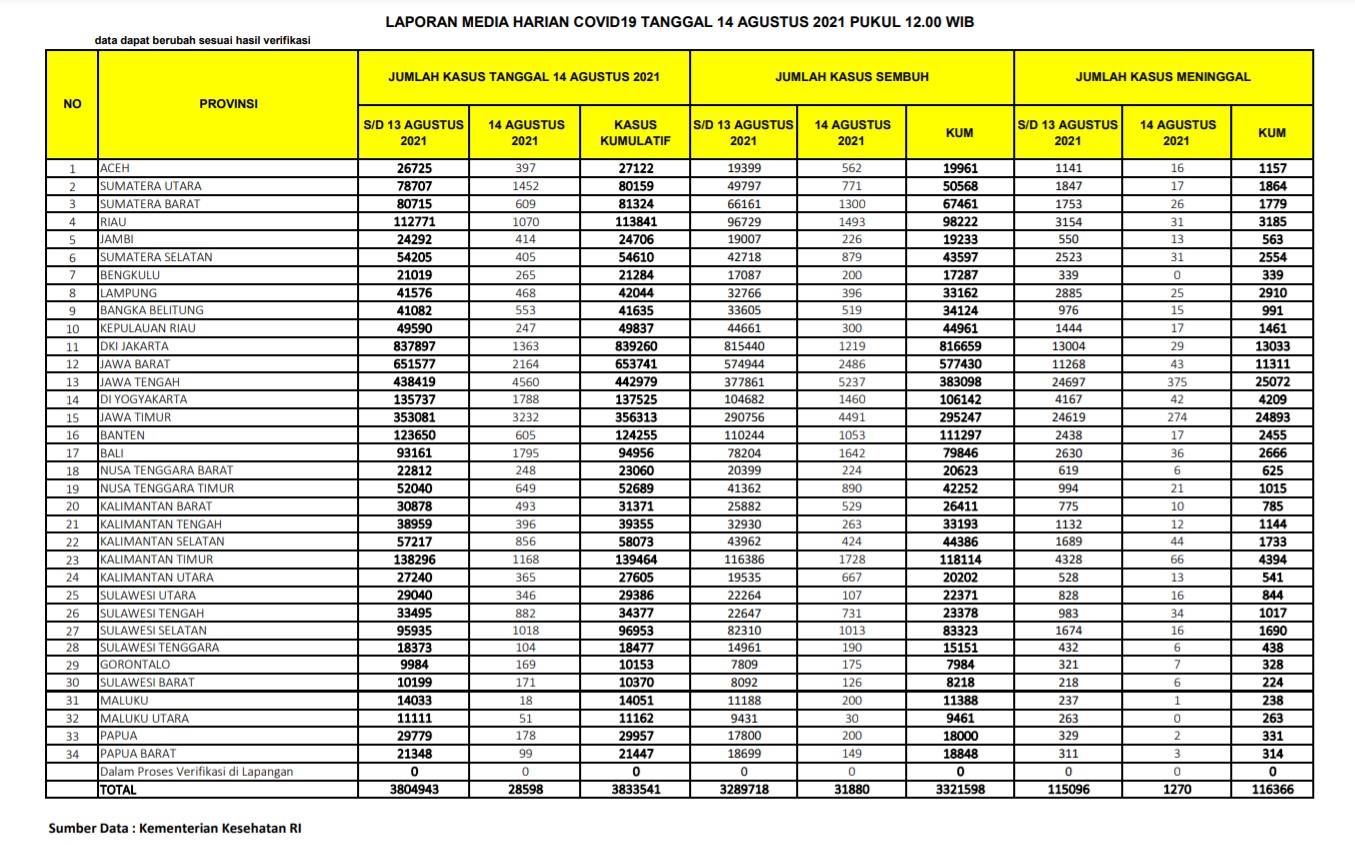 Berikut adalah data COVID-19 di seluruh provinsi pada tanggal 14 Agustus 2021: