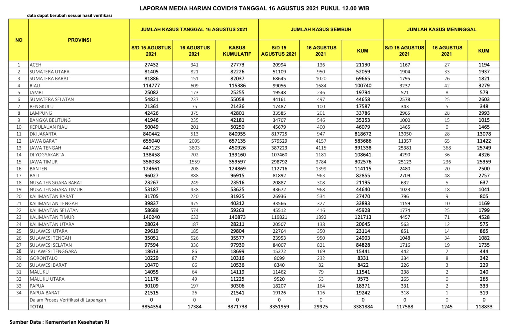 Berikut adalah data COVID-19 di seluruh provinsi pada tanggal 16 Agustus 2021: