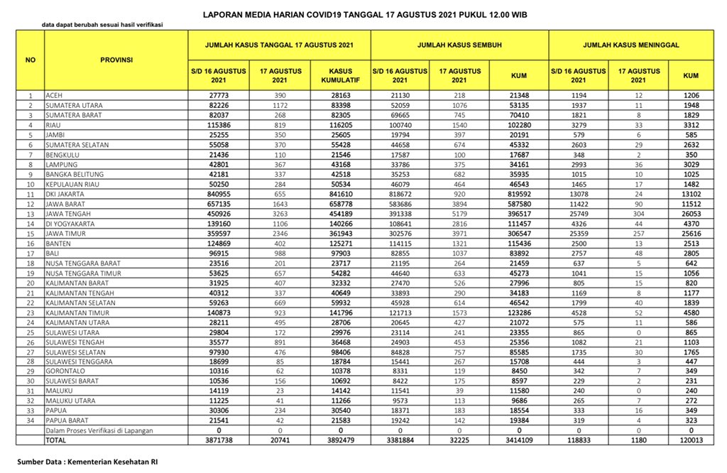 Berikut adalah data COVID-19 di seluruh provinsi pada tanggal 17 Agustus 2021: