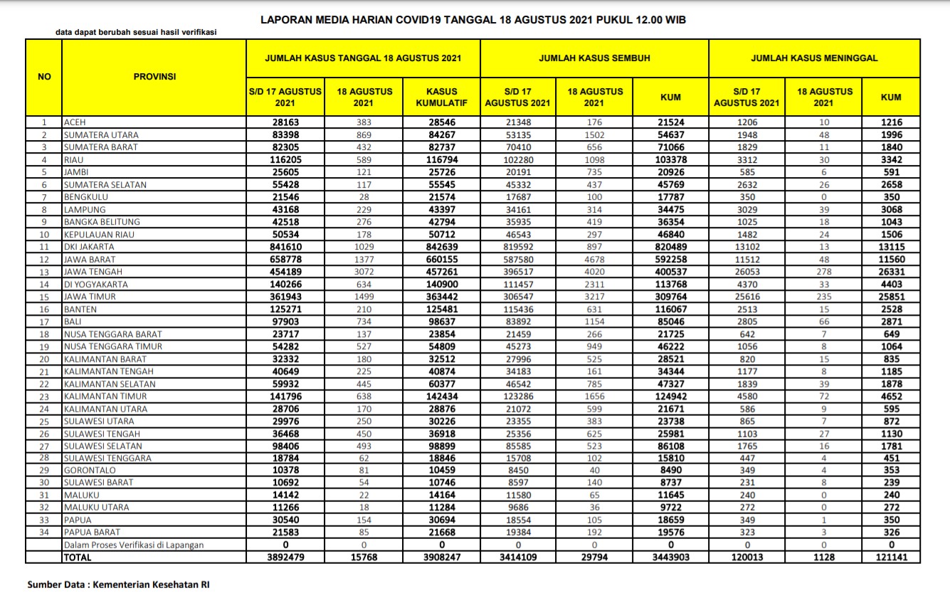 Berikut adalah data COVID-19 di seluruh provinsi pada tanggal 18 Agustus 2021: