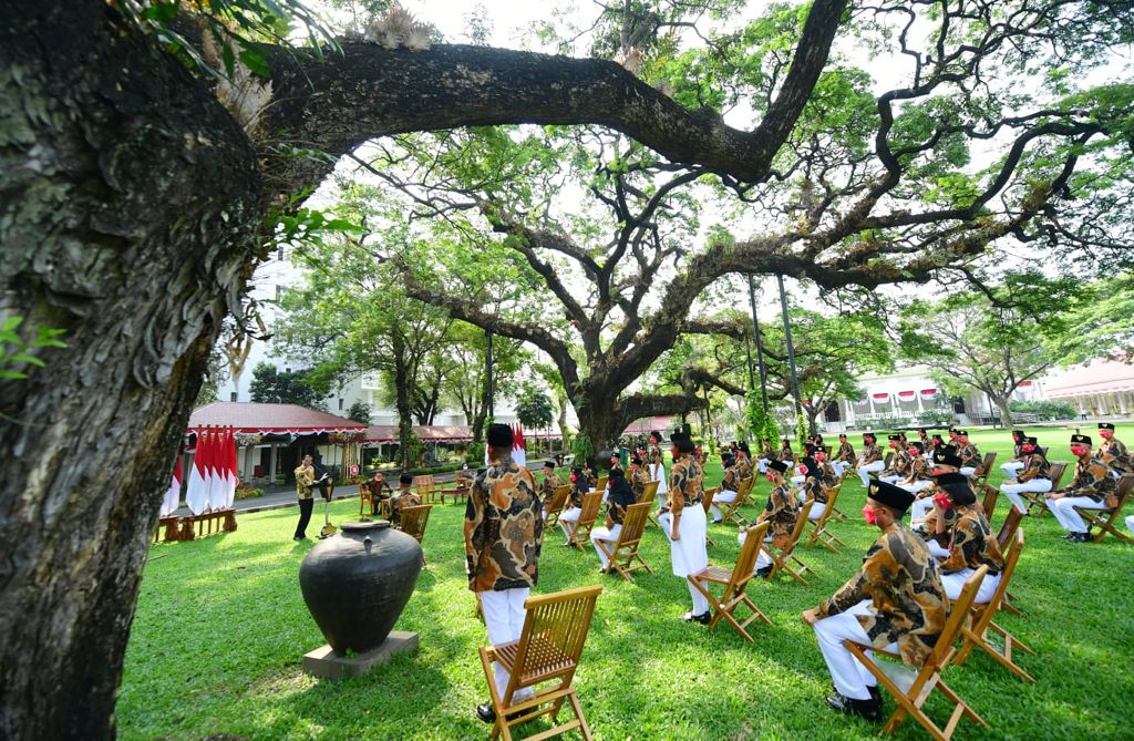 “Kenapa Saudara-Saudara semuanya dijadikan Duta Pancasila? Kita ingin Pancasila ini menjadi ideologi yang bekerja sehingga harus kita bumikan dalam kehidupan kita sehari-hari, bukan hanya slogan, bukan hanya hafalan, seperti tadi disampaikan oleh Bu Mega. Nilai-nilai luhur yang terkandung di dalamnya harus menjadi panduan, harus menjadi inspirasi bagi seluruh anak bangsa dalam karya nyata di dalam kehidupan bermasyarakat, berbangsa, dan bernegara,” ungkap Presiden Jokowi saat memberikan pengarahan kepada para Purnapaskibraka tahun 2021 di halaman tengah Istana Merdeka, Jakarta, pada Rabu, 18 Agustus 2021.