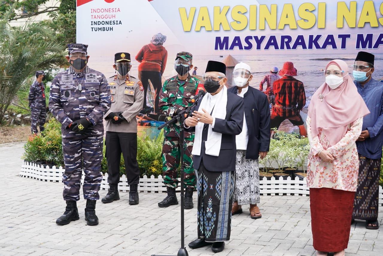 Sepuluh menit berselang, Wapres beserta Ibu Wury didampingi Kasal beserta istri, Gubernur Banten, Pangdam III/Siliwangi, dan Kapolda Banten, serta perangkat terbatas kemudian menuju GOR Penata dengan berjalan kaki untuk meninjau pelaksanaan vaksinasi Covid-19 kepada para santri dan masyarakat sekitar pesantren.