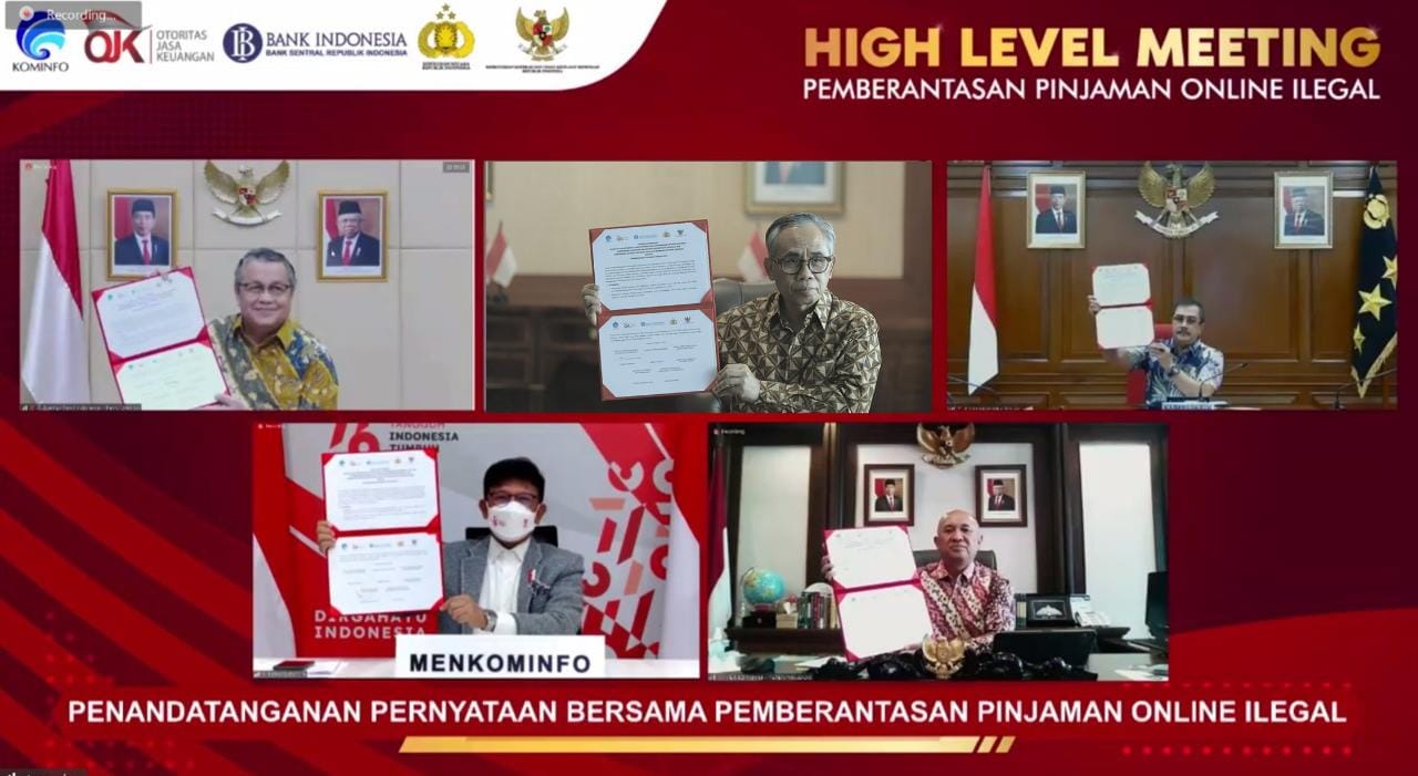 (Vibizmedia – Economy & Business) Lima kementerian/lembaga (K/L) menegaskan komitmennya untuk memperkuat langkah-langkah pemberantasan pinjaman online (pinjol) ilegal yang tengah marak terjadi dan merugikan masyarakat. Komitmen tersebut disampaikan dalam pernyataan bersama pimpinan lima K/L tersebut, yaitu Ketua Dewan Komisioner Otoritas Jasa Keuangan (OJK) Wimboh Santoso, Gubernur Bank Indonesia (BI) Perry Warjiyo, Kepala Kepolisian Negara Republik Indonesia (Kapolri) Jenderal Listyo Sigit Prabowo, Menteri Komunikasi dan Informatika (Menkominfo) Johnny G. Plate, dan Menteri Koperasi dan Usaha Kecil dan Menengah (Menkop UKM) Teten Masduki, Jumat (20/08/2021).