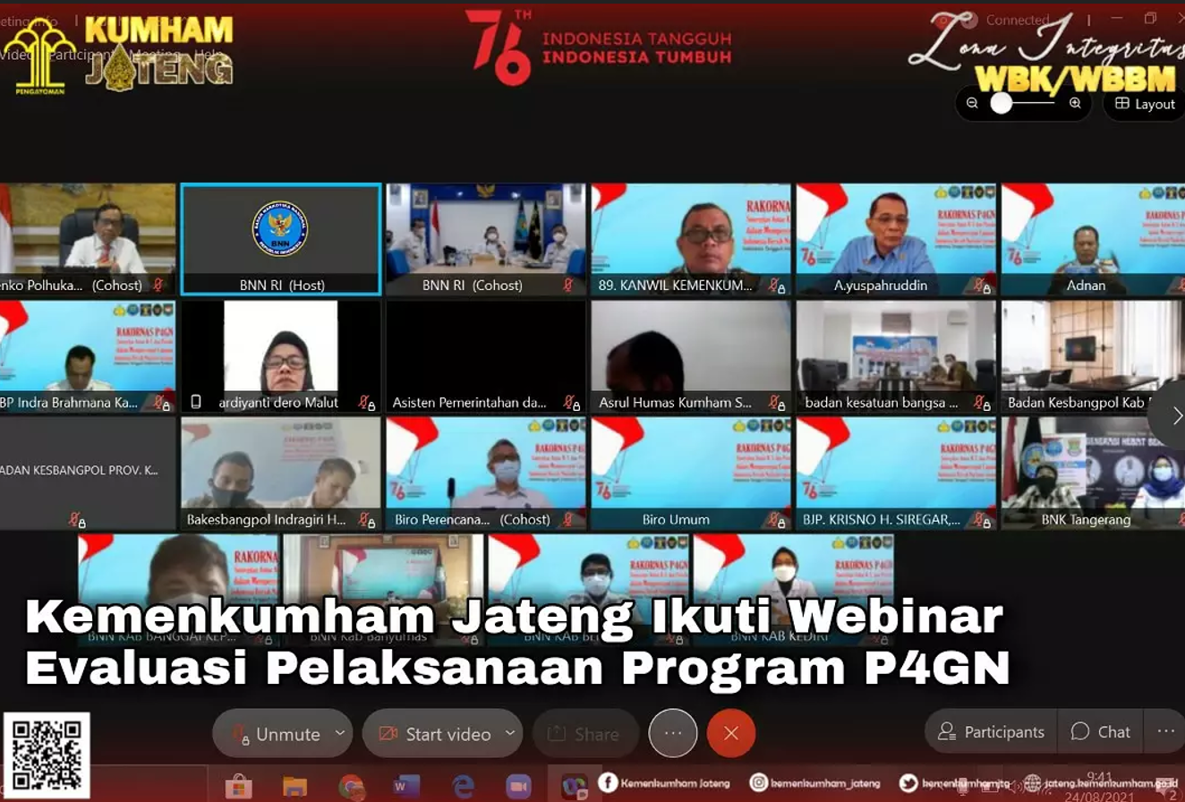 (Vibizmedia – Nasional) SEMARANG – Tunjukan dukungannya terhadap program Pencegahan dan Pemberantasan Penyalahgunaan dan Peredaran Gelap Narkotika (P4GN), Kepala Kantor Wilayah Kementerian Hukum dan HAM Jawa Tengah, A.Yuspahruddin berpartisipasi secara virtual pada Webinar bertajuk Evaluasi Pelaksanaan Program P4GN, Selasa (24/08/2021).