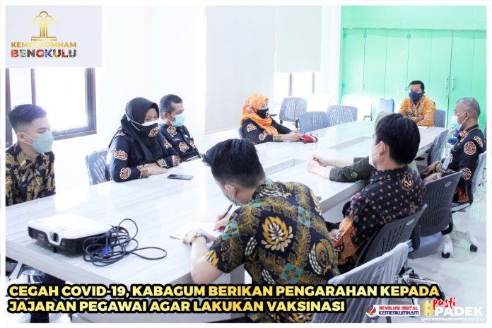 (Vibizmedia – Nasional) BENGKULU – Bertempat di ruang fatmawati, Kanwil Kemenkumham Bengkulu (26/8/2021), Kepala Bagian Umum (Pungka Sinaga) memberikan pengarahan kepada jajaran pegawai Kanwil Kemenkumham Bengkulu yang belum melaksanakan vaksinasi Covid-19. Dalam arahannya kabagum mengingatkan jajaran pegawai untuk melaksanakan vaksinasi demi kebaikan bersama guna pencegahan terhadap Covid-19, baik vaksinasi dosis 1 atau dosis 2. “Pelaksanaan vaksin merupakan salah satu memutus mata rantai penyebaran COVID-19 di Bengkulu, karena vaksin ini pada dasarnya meningkatkan kekebalan tubuh yang mampu menangkal penyebaran COVID-19” Ungkapnya.