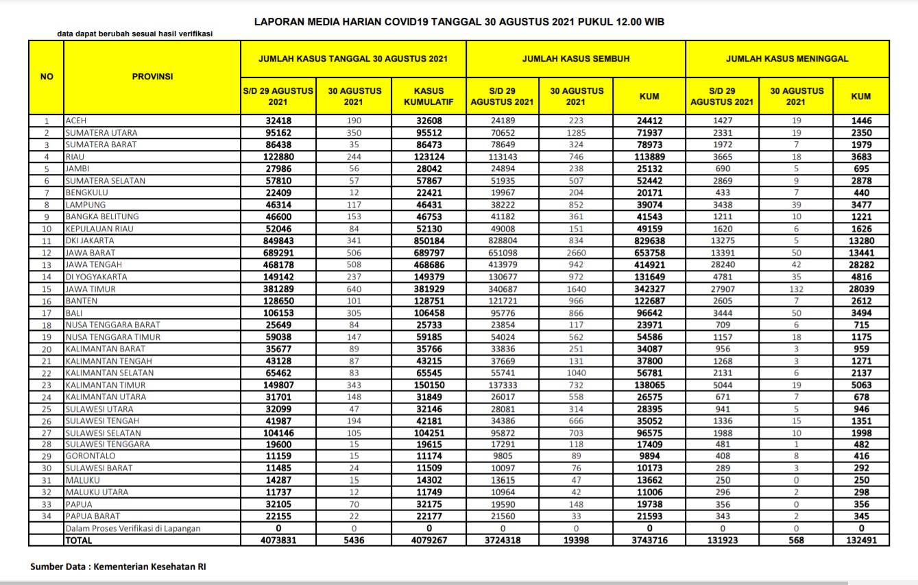 Berikut adalah data COVID-19 di seluruh provinsi pada tanggal 30 Agustus 2021: