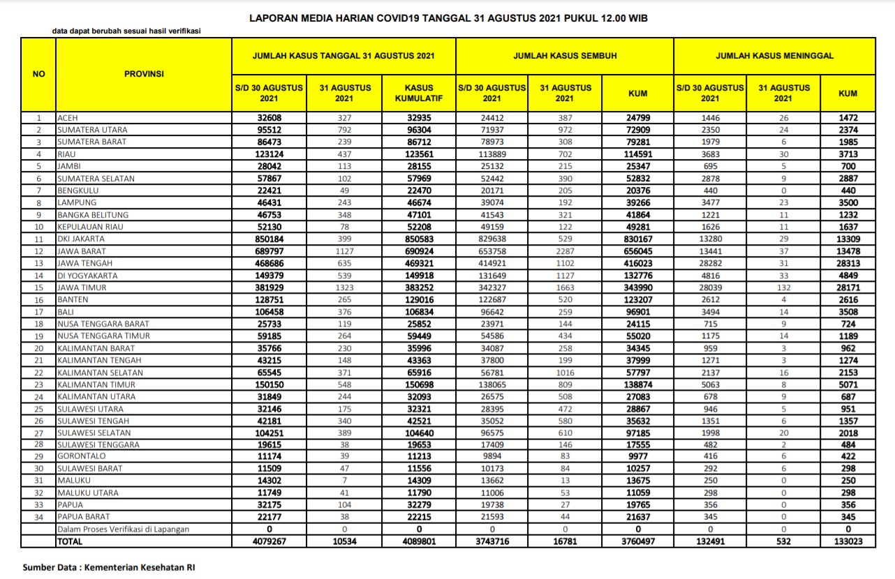Berikut adalah data COVID-19 di seluruh provinsi pada tanggal 31 Agustus 2021: