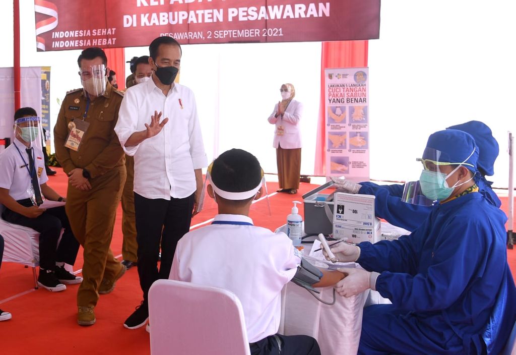 (Vibizmedia-Nasional) Presiden Joko Widodo meninjau kegiatan vaksinasi bagi 1.000 pelajardari berbagai sekolah yang digelar di SMP Negeri 1 Pesawaran, Provinsi Lampung, pada Kamis, 2 September 2021.