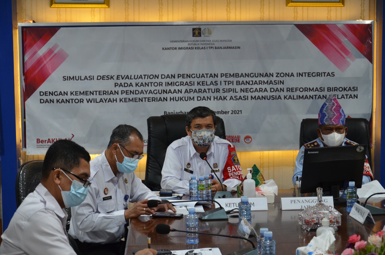 (Vibizmedia – Nasional) Banjarbaru, Humas_Info – Dalam rangka mewujudkan predikat Wilayah Bebas dari Korupsi, sebagai salah satu upaya dalam pembangunan Zona Integritas, Rabu (1/9) Kepala Divisi Keimigrasian, Teodorus Simarmata pimpin langsung Simulasi Desk Evaluation dan Penguatan Pembangunan Zona Integritas pada Kantor Imigrasi Kelas I TPI Banjarmasin. Terselenggaranya kegiatan tersebut merupakan hasil kerjasama dan dukungan dari Tim Penilai Nasional (TPN), Kementerian Pendayagunaan Aparatur Sipil Negara dan Reformasi Birokrasi. Hal ini dilakukan dalam sebagai salah satu langkah persiapan Kantor Imigrasi dalam menghadapi evaluator TPN.